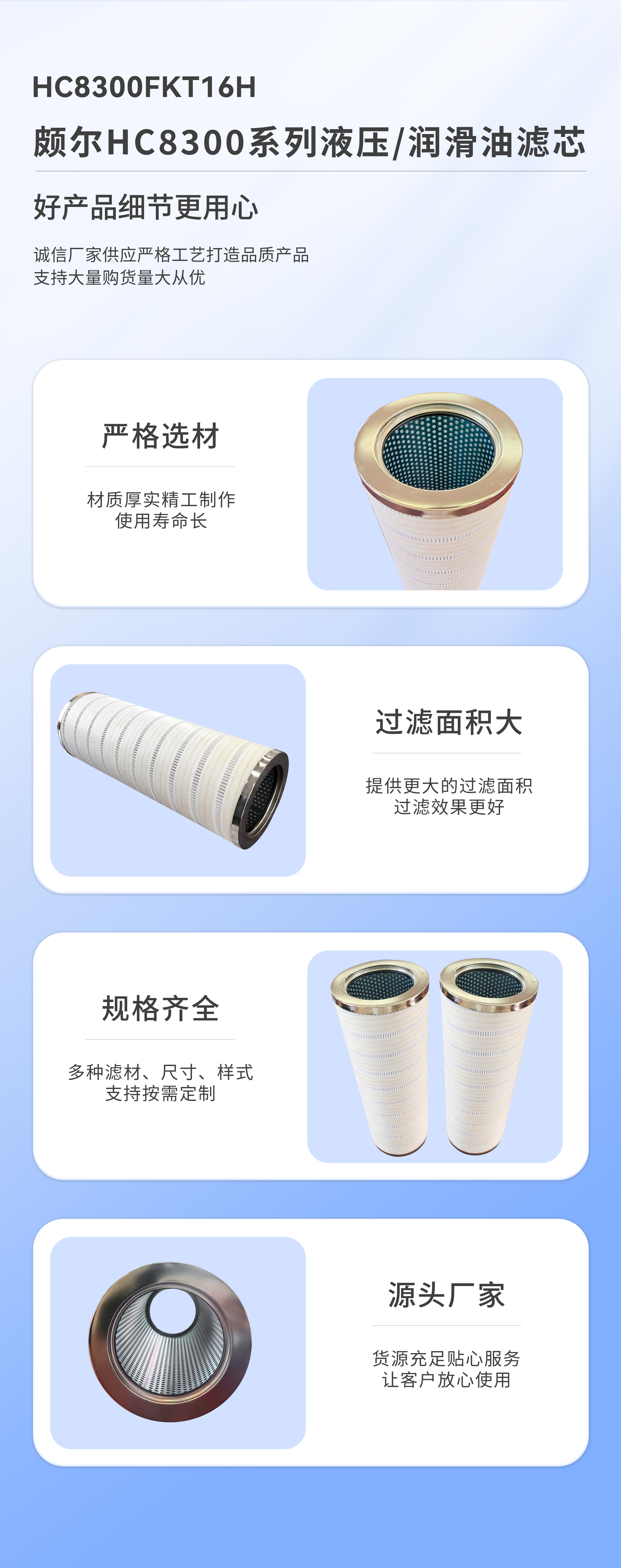 【產(chǎn)品簡介】: 頗爾濾芯HC8300系列用于液壓、潤滑系統(tǒng)的壓油過濾,用以濾除系統(tǒng)中污染物,系統(tǒng)的正常運(yùn)行,公司生產(chǎn)的濾芯采用的是進(jìn)口濾材,具有的技術(shù)含量,納污除塵的性能較強(qiáng),完全可以替代進(jìn)口的濾芯使用。