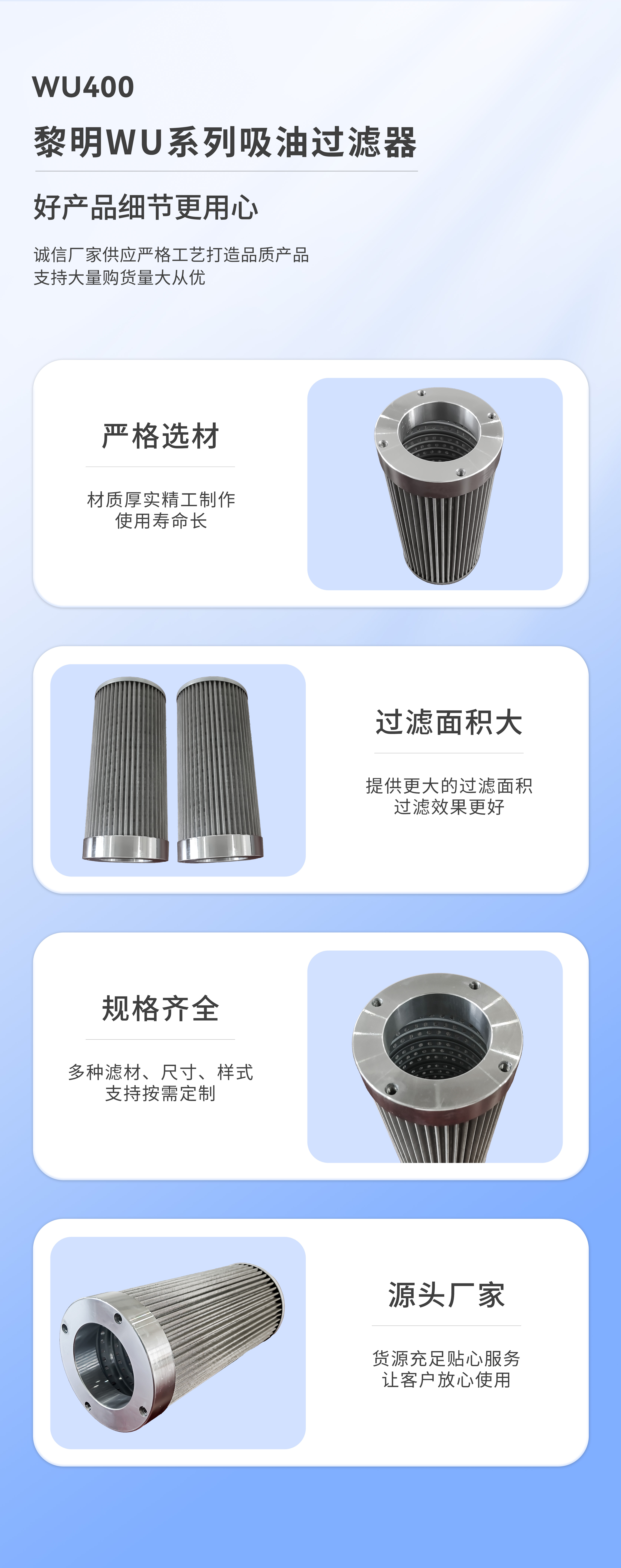 【產(chǎn)品簡(jiǎn)介】:液壓濾芯由上、下端蓋,濾層(由過濾層、支撐層、均流層)以及骨架組成,濾層以圓柱體的形狀以圓柱體的形狀固定在內(nèi)、外骨架之間,并在上、下端蓋處密封,應(yīng)用時(shí)根據(jù)實(shí)際情況確定液體的流動(dòng)方向(從濾芯外流向?yàn)V芯內(nèi)部或從內(nèi)部流向外部)。流量:400L/min 精度:80、100、180微米可選。